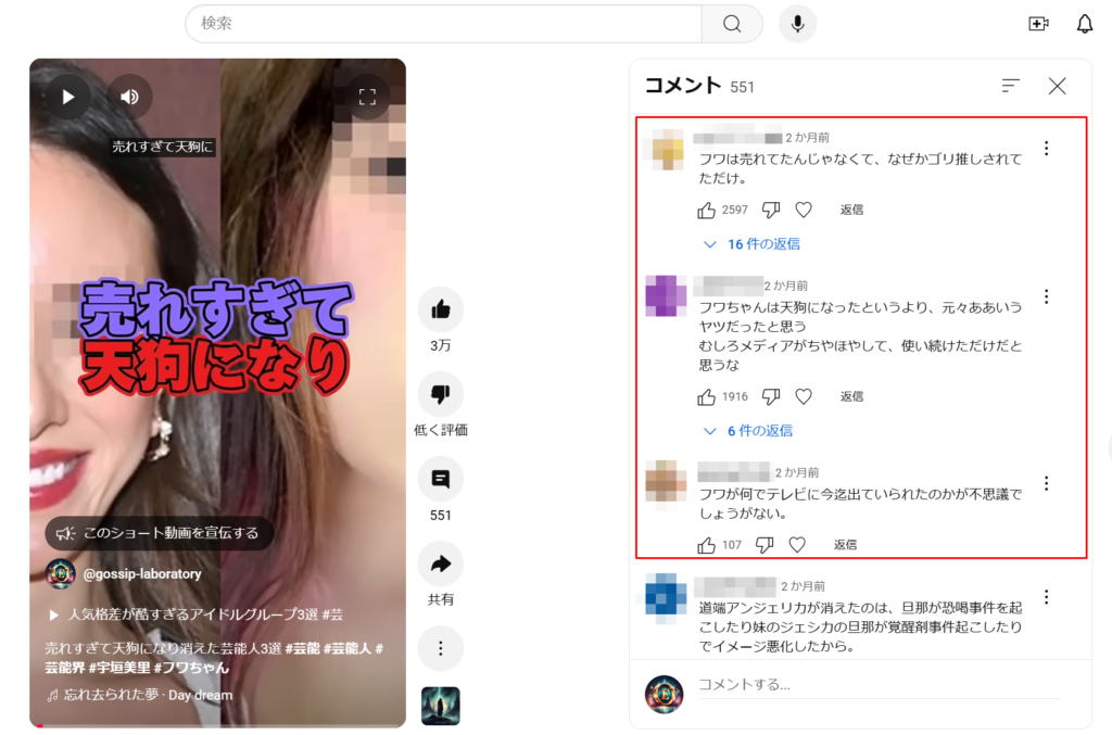 実際にコメント欄を見るとフワちゃん関連のコメントに多く高評価や返信がついている事が分かりますね。