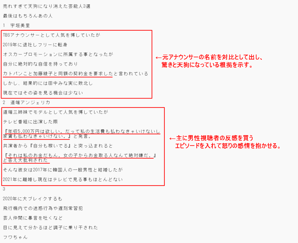 宇垣美里さん…絶大的な人気を誇っていた加藤綾子さんの名前を出し、同額の契約金を要求したとのエピソードを入れる事で人気を比較させています。