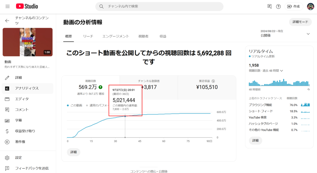 この動画は約1ヵ月間で約500万再生され、アドセンス収益と楽曲収益を合わせて合計15万円の収益が発生しました。