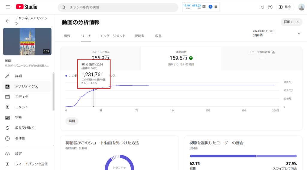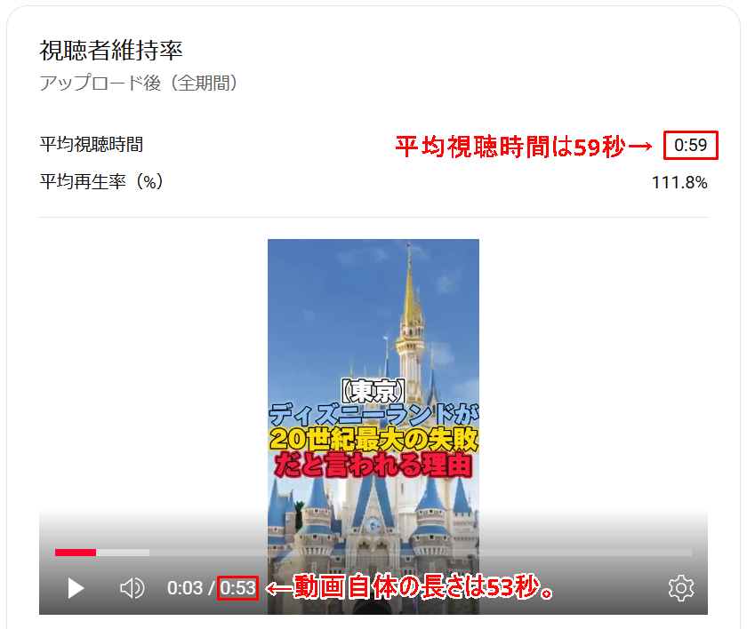 動画自体の長さは“53秒“にも関わらず、平均視聴時間が“59秒“である事が分かりますね。